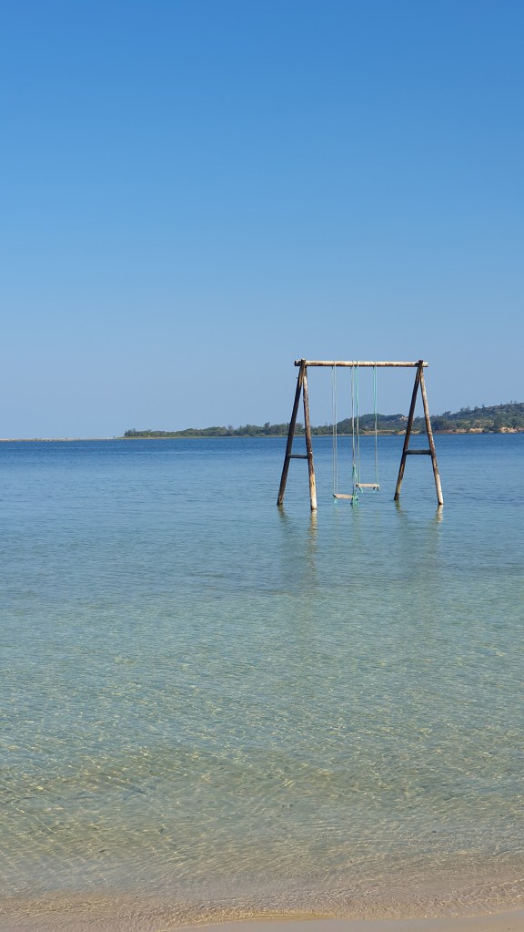 In the video you try to climb up on a swing set in the lagoon. An uneven green horizon separates the blues. You are maybe twenty meters away, your swimsuit white and your shoulders sunkissed against the blue of the lagoon. The rope slips, the swing follows and you fall in the water. You turn around and at the same time the camera dips as the person behind it, me, also bends over from laughter. Your laughter takes clear leaps between the open surfaces of the water and the sky.