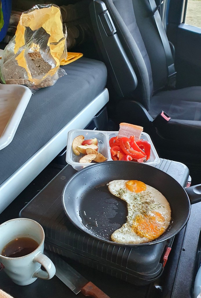 We crossed the border to Germany in the evening after having driven through France all day, and I got to sleep in the top bunk of the cabin. In the morning he asked me to make the breakfast. At this point, I already knew where all the stuff was, and I was happy to fry us some eggs and bacon. And of course, bread. I saw it made him happy too, having someone cook for him.