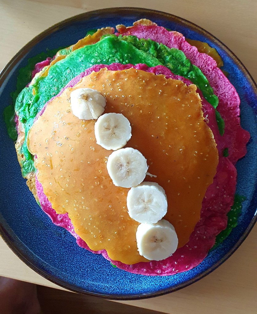 I look back at the plate with the massacred, pink mess. She is right, and we both burst out laughing. I agree that maybe this wasn’t the best idea, or maybe I justify it, I don’t remember, as I pour new batter, this time green, onto the frying pan.