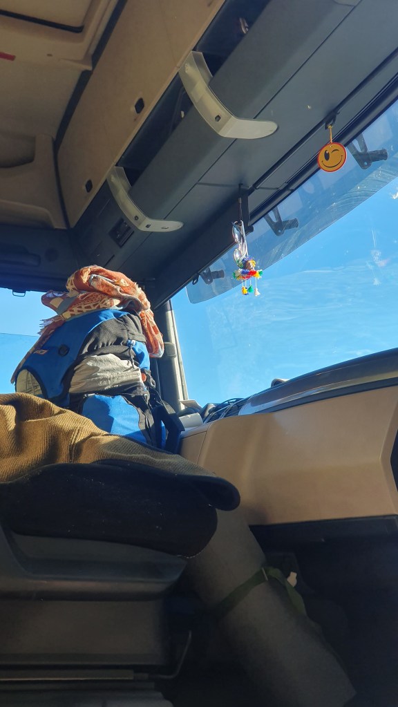 I ask a few drivers, two, they are not going my way but deeper into France. Doesn’t matter. A truck in the far corner starts its engine, good sign, probably just wrapping up his break and heading out for a good 4 hours. I approach quickly, on a whim, probably he will say no as he is on his way, but yeah, it doesn’t matter.