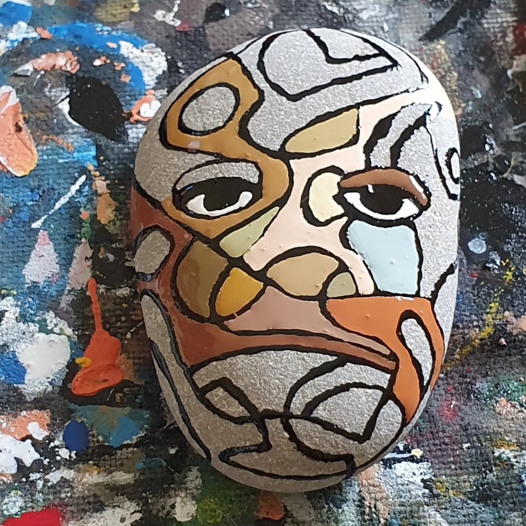 The walls are bulging with paintings and colors and I take a slow tour around the room and let the artworks pull me into them. There’s a lot of energy. My friend is playing reggae music on his phone and slowly working on a piece. He’s painting on rocks and is currently laying down a thin-thin outline of a face with a brush that only seems to have three-four strands left. He invites me to paint and in the corner of the room I choose a rock from a pile.