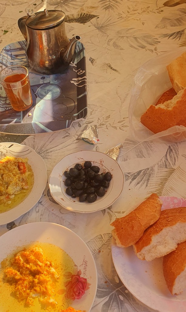 But what I crave the most is a simple meal prepared for me by my first host in Casablanca, easy and cheap: two eggs, scrambled loosely with a pinch of salt and cumin. Served on a plate, add oil, more, more cumin, fresh and fragrant. Break your fresh hobbs and dip it in the oil, pinch the eggs with the bread between your fingers, occasionally alter with a black olive, strong. Small sips of hot tea, served best with sunshine peeking thourgh the window