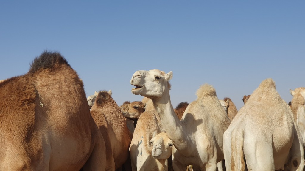 Hadmine brings me to the camel market and I see the gentle, weird creatures for the first time up close. The herders don’t need force to prod the camels along. Their feet are tied, sometimes the front feet together and sometimes one front foot to a back foot, making their steps short and undignified. Still they look gentle and remain calm as the groups move where the herders desire. They bump into each other, their curiously bent necks swaying, weaving over and under each other, into sides and humps but with no ill demeanor, no frustration. They seem equally at peace as when they stand ruminating, chewing cud or simply gazing through their half-closed, dreamy eyes. Sometimes, without any apparent reason and with intentions unknown to me, they sing. I enjoy them. I enjoy their calm and their heavy smell. I enjoy knowing that creatures like this exist.