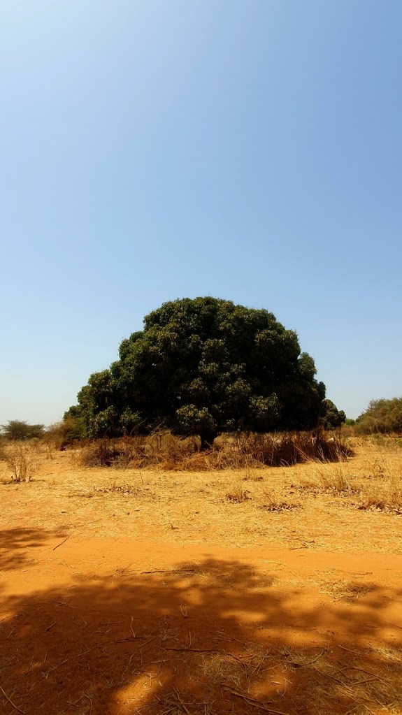 I live in a guest house of one of these houses. It is a round building, white on the outside and on the inside. One single, spacious room and an adjacent bathroom with no door, a double bed and a desk build into the wall. White tile floors on which I constantly leave reddish-brown footprints. The main house next to me is also round but bigger, with a high, thatched roof, outdoors kitchen and sheltered patio. The garden is big. It has a well, plenty of mango trees, a few cashew trees, a baobab tree, a young tamarin and grape tree. A bunch of small plants I don’t know and a big rack to dry mangoes. Small squirrel-like animals frequent to look for food, lizards scramble up and down the walls and pillars, stopping still to look at me. Birds chatter from the trees, the small ones with the bright yellow plumage coming to pick off the bright yellow flowers growing by the kitchen. Sometimes monkeys come, but they are shy and run away as soon as they hear someone moving.