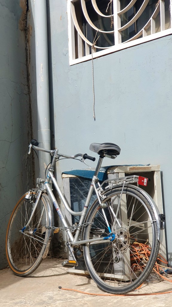 On one of my detours I turned into a hardware shop and asked for the price of the bike leaning against the tree outside: 85 000 CFA. The seller barely looked up from his phone. The bike looked proper: the kind of high frame I prefer, steel, straight and basic with a back carrier.
