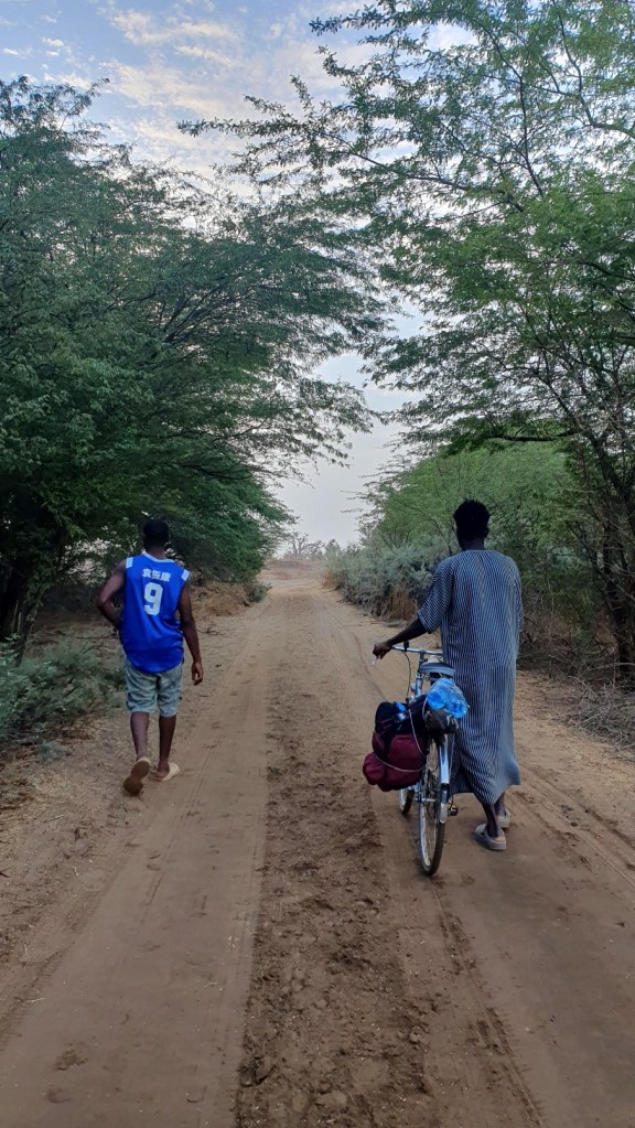 I can hear the big road coming closer. I take over leading my bike. The backpack tied to the carrier, I am ready. My friends head home and I continue to follow the sand tracks, the distance growing between our backs. For the second time in two days, I am leaving home.