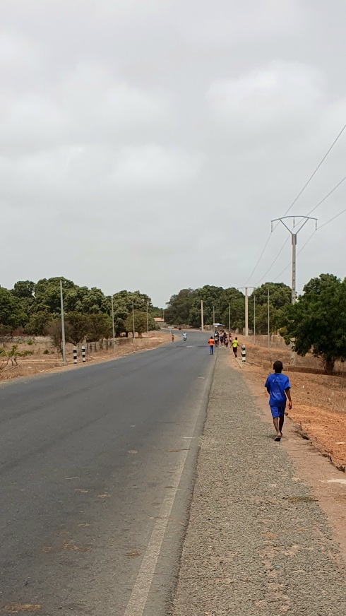 As I get up on the main road, the people are starting to wake up. Motos and carriages pass me, a few cars. People turn their heads and gradually, the yelling begins; “toubab, toubab!”