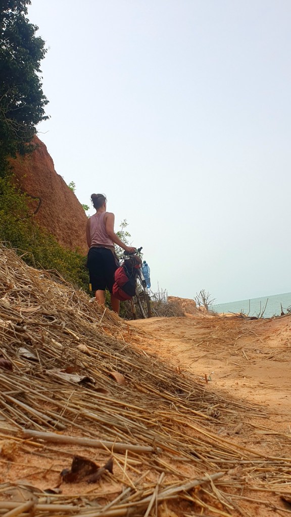 But the beach turns out to be desolate and littered with trash. Small sheet metal houses are struck up along it and the families look at me as I pass. My feet sink into mushy, stinking seaweed and plastic. I climb up a few rocks, lift and drag the bike up after me to take the small path that turns around the cliff. Maybe around the bend I can find some clean sand with nobody staring at me?