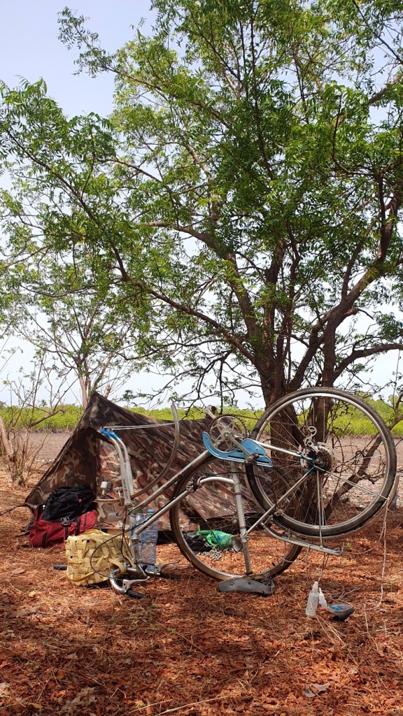I had to crouch underneath a wire fence and drag my bike after me to get here last night; next to this dry river bed, dry bushes and litter, tucked away in a corner of the small town of Toubacouta. Now the sun is beaming down and I gather moist branches and bark and heave air from the depths of my lungs and into the roots of my suffering fire to make my coffee boil. A sticky, sweet-yellow mango for breakfast.