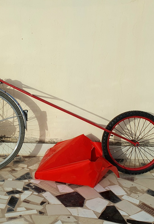 And so I turn my life into squares, center my steps around dance classes and social dances, bus timetables and cultural events. I still walk an hour to dance class with my audiobooks and the weekends are for salsa, kizomba and karaoke. I fill the gaps in my schedule by researching and sketching up the carriage model, biking around to look for a welder who will give me the best price and searching for the material for the carriage-bag. I research visas and the duration of the rainy season. When the sun starts to set and the air gets cooler I go up to the rooftop and paint the frame of the carriage, cut and measure the material for the bags, glue them together. I sit and think, sketch up designs in my head until it’s dark and the mosquitoes drive me inside.