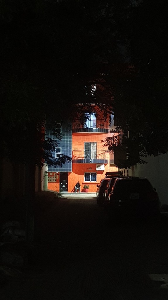 The dogs won’t touch me. A taxi or moto might slow down, the head turn to me but one calm no-no-finger and a small shake of my head, off they go again. Flat cardboard and plastic wrappings scattered from the day. The high houses looming, looking down with black squares for windows: no one living there yet.