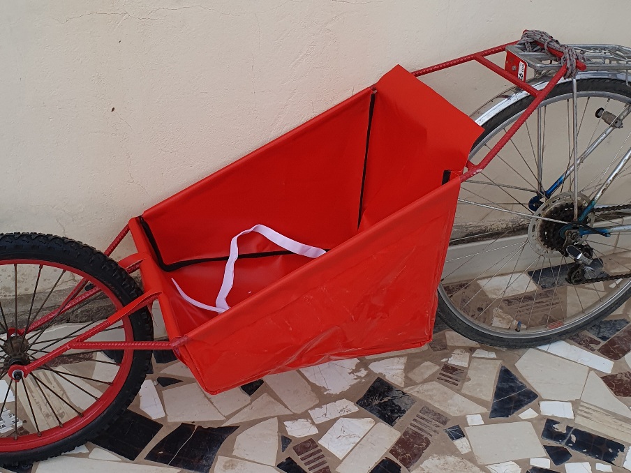 I paint the frame red. The bags are red, too. I tie the end of the carriage to the luggage rack with rope and a little slack, try to make it the same distance. This is a temporary solution; later on I need to find a way to make a joint.