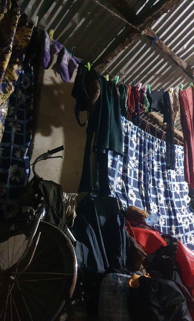 They make room on the clotheslines for my things. They bring me a simple mat and they bring me a pillow. They invite me to eat but I see that they have only barely enough for themselves, so I decline and tell them I have eaten. They are not overly curious about me, not smiling and overbearing; they probably take me in because of a sense of duty, and that thought makes me feel even worse. I try, but I am too tired to small talk and too wet and sorry to be of any interesting company. I just need to lay down and sleep. And dry. They leave me to it, file out from the hallway and turn the light off on the way.