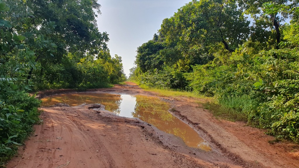 The road from the Guinea-Bissau border post to the Guinean border post has been the worst one yet, but manageable by bike. I exchanged all of my CFA to Guinean francs there already, got almost the same rate as my internet search suggested, ate a big portion of beans, bread and mayo though I wasn’t hungry, but just to use the last change, and so I have all the time in the world, no needs to fulfill. The men at the border control don’t ask for any bribes, not even my number; in the receding heat of the day they are relaxed and cheerful. Even stumbling back into French feels somehow easy. They invite me to sit and we chat. I watch them play checkers for a little longer, say hello to somebody’s wife. Then I am then waved off and well-wished into this new country, and off I go again along the crumbling forest road.