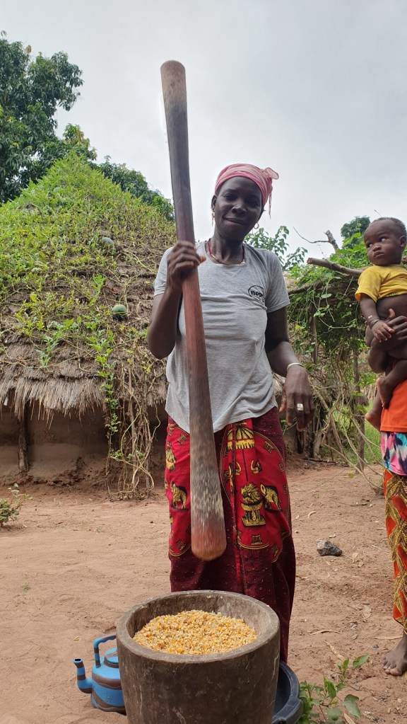 The neighbor lady has begun the morning by crushing hard grains of maize in a big wooden mortar. The pestle is longer than her upper body. She lifts it up above her head and brings it down on the grains with rhythmic, powerful thumps; the same thumps that echo all around the village. I ask her for a photo and she smiles and holds the pestle even higher, then brings it down with one hand and equal ease. Another neighbor joins, her baby tied to her back, and the two of them work in tandem, alternating to bring down their pestles with even rhythm.